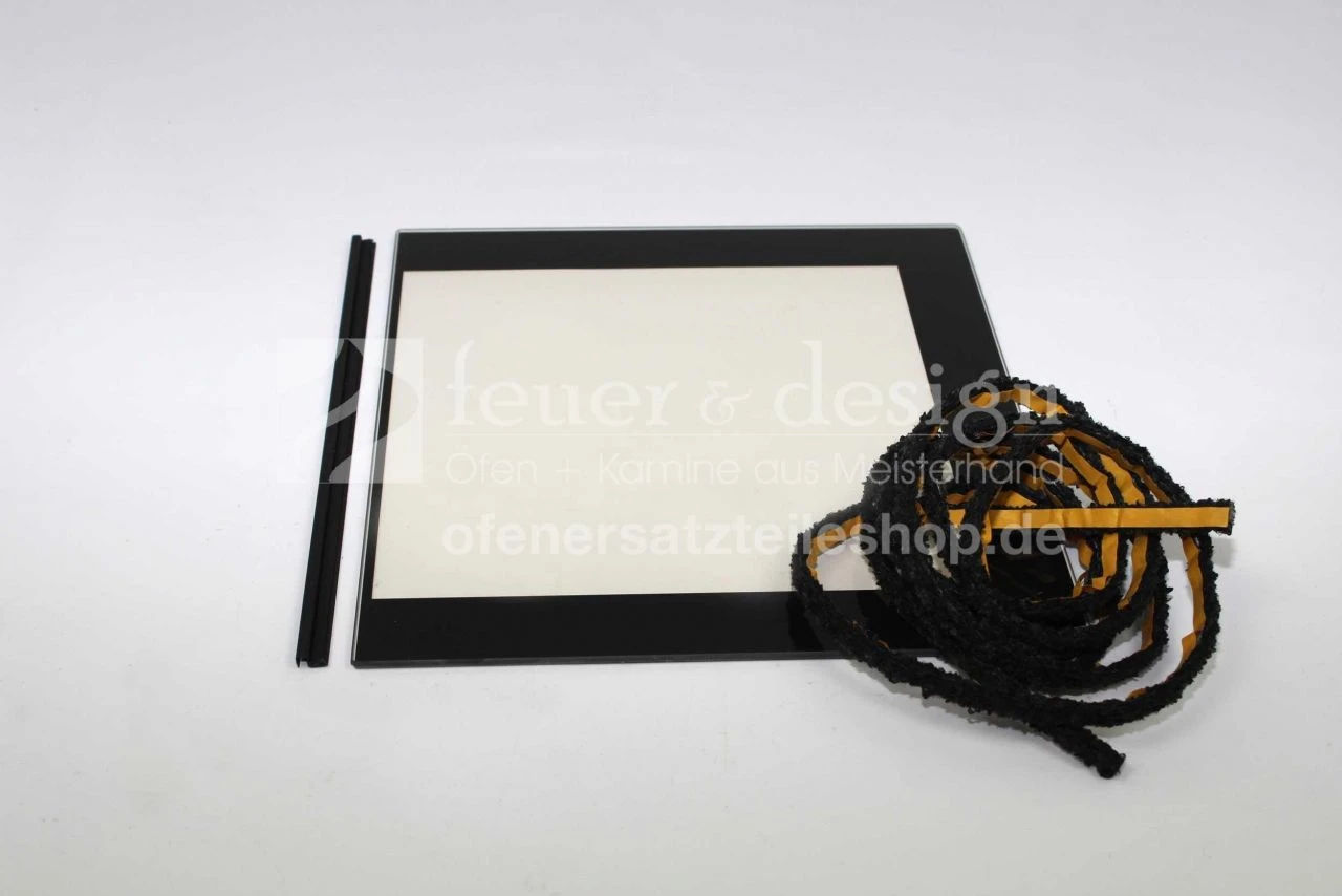Im Set enthalten ist die weiterhin benötigte Schiene und ein selbstklebendes Flachdichtungsband zum Abdichten der Kaminofenscheibe