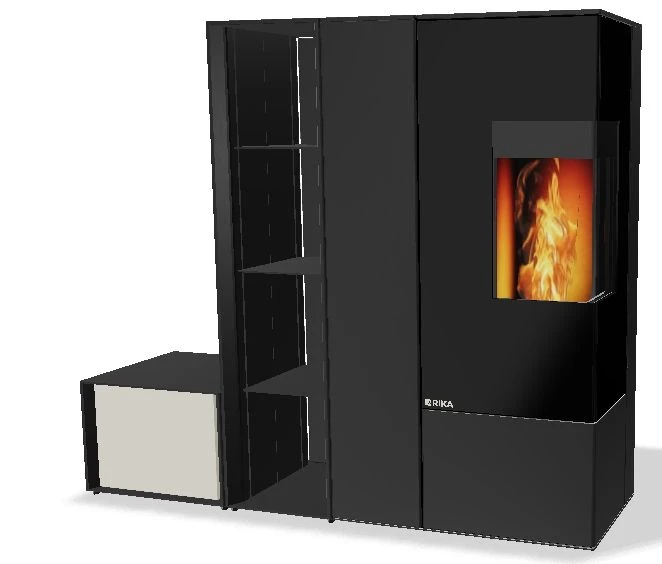Rika Connect Edge Anbauelemente zu Pelletofen E26 oder E40 in schwarz | Kasten mit Einlegeböden | Bank mit Dekortür weiß